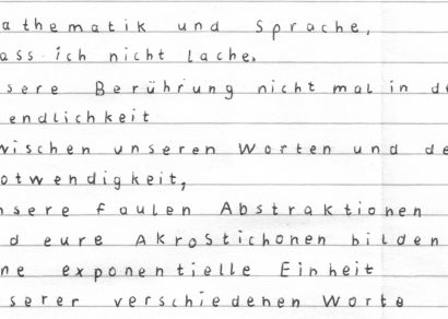 Unendlichkeit Mathematik und Sprache,dass ich nicht lache.Unsere BerĂŒhrung nicht mal in der Unendlichkeitzwischen unseren Worten und der...